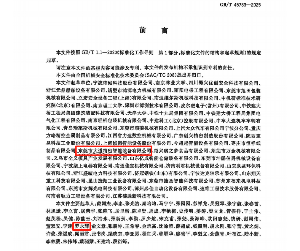 近日,東莞市大道精密智能裝備有限公司(以下簡稱“大道精密”)喜訊頻傳:公司作為文件起草單位參與制定的國家標(biāo)準(zhǔn)《GB/T 45783-2025 機械安全 安全防護授權(quán)系統(tǒng) 基本要求》正式發(fā)布,同時榮獲廣東省工業(yè)和信息化廳頒發(fā)的“專精特新中小企業(yè)”稱號。雙重榮譽不僅是對企業(yè)技術(shù)研發(fā)能力的高度認可,更彰顯了其在推動行業(yè)標(biāo)準(zhǔn)化進程和智能制造安全發(fā)展中的引領(lǐng)作用。