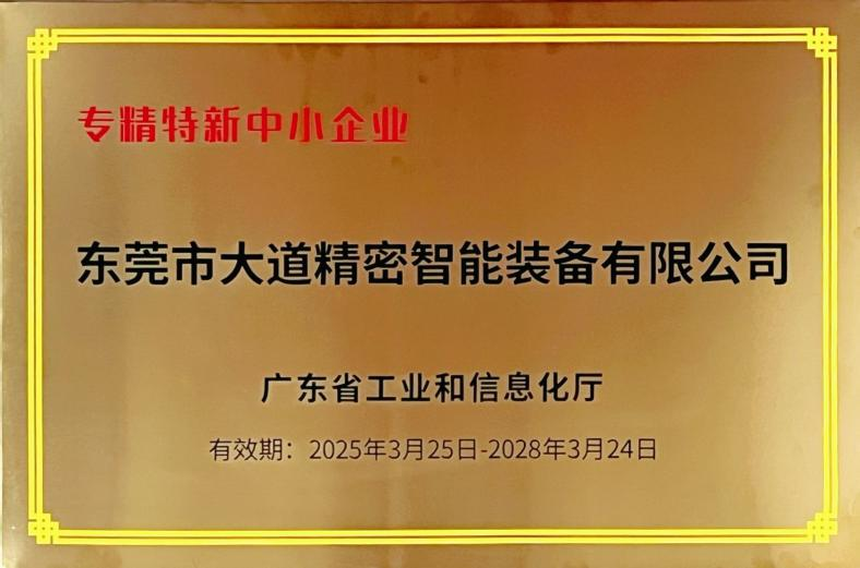 2024年12月19日,大道精密已被評定為廣東省“專精特新”中小企業(yè)。該資質(zhì)認定聚焦于具備“專業(yè)化、精細化、特色化、新穎化”特征的中小企業(yè),是對企業(yè)在細分市場技術(shù)優(yōu)勢、創(chuàng)新能力及發(fā)展?jié)摿Φ臋?quán)威背書。大道精密長期深耕精密智能裝備研發(fā),在自動化控制、安全防護系統(tǒng)集成等領(lǐng)域形成多項核心技術(shù),產(chǎn)品廣泛應(yīng)用于新能源、汽車制造、精密電子等行業(yè),以高可靠性和智能化水平贏得市場口碑。